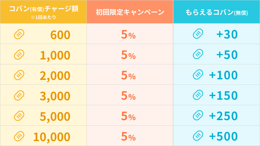 キャンペーン期間中にはじめてコバン(有償)をチャージされた方全員に、初回チャージ額の5%のコバン(無償)を付与します。