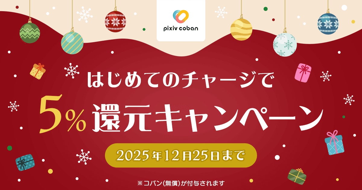 2025年12月2日(火)より、pixivcobanをまだ利用されたことがない方を対象に、「はじめてのチャージでおトク!5%還元キャンペーン」を開催中です。