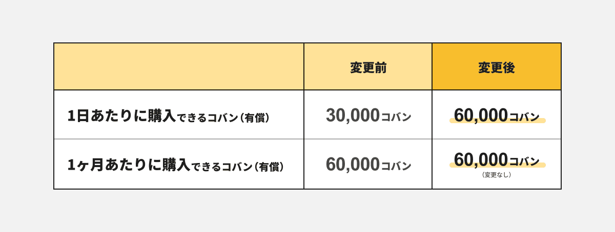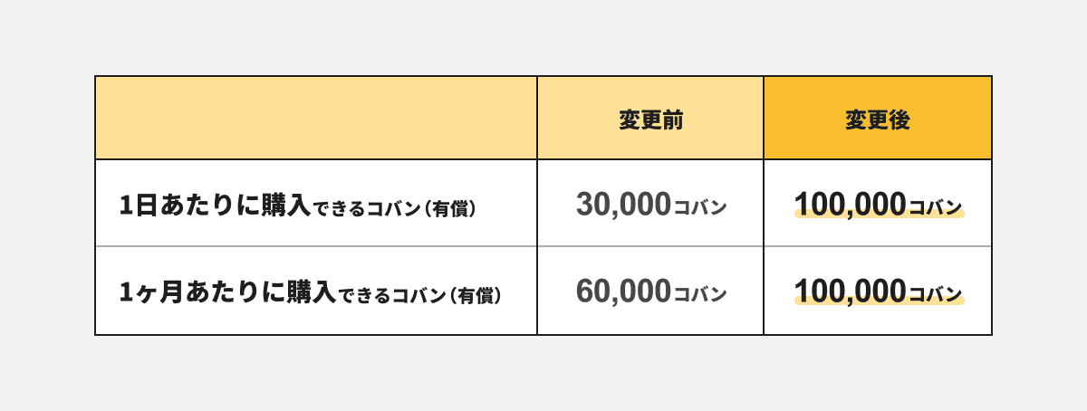 1日(直近24時間)あたり、および1ヶ月(直近30日間)あたりに購入できるコバン(有償)を以下の通り変更します。