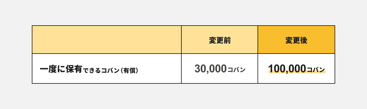 この度、コバン(有償)の購入上限額および保有上限額の引き上げを実施しました。