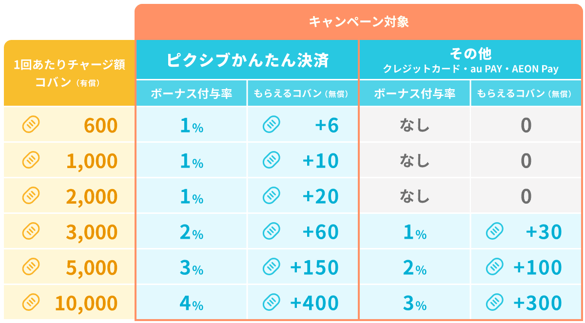 キャンペーン期間中、1回あたり3,000コバン(有償)以上をチャージすると、チャージ完了後にチャージ額に応じて1~3%分のコバン(無償)を付与します。